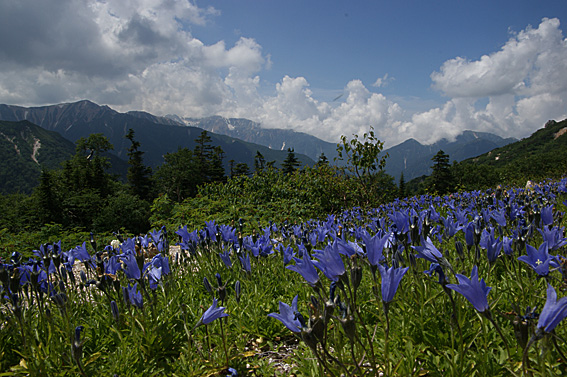 烏帽子小屋の前に広がる、イワギキョウの群落と赤牛岳、薬師岳です。ローアングル撮影が可能なα350にカメラを替えたので、このような撮影も楽になりました。